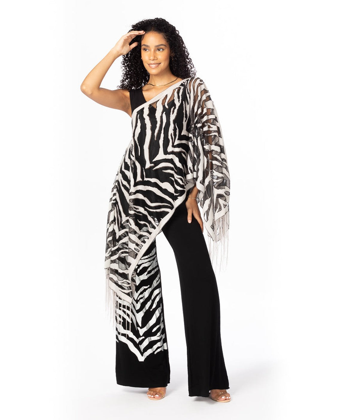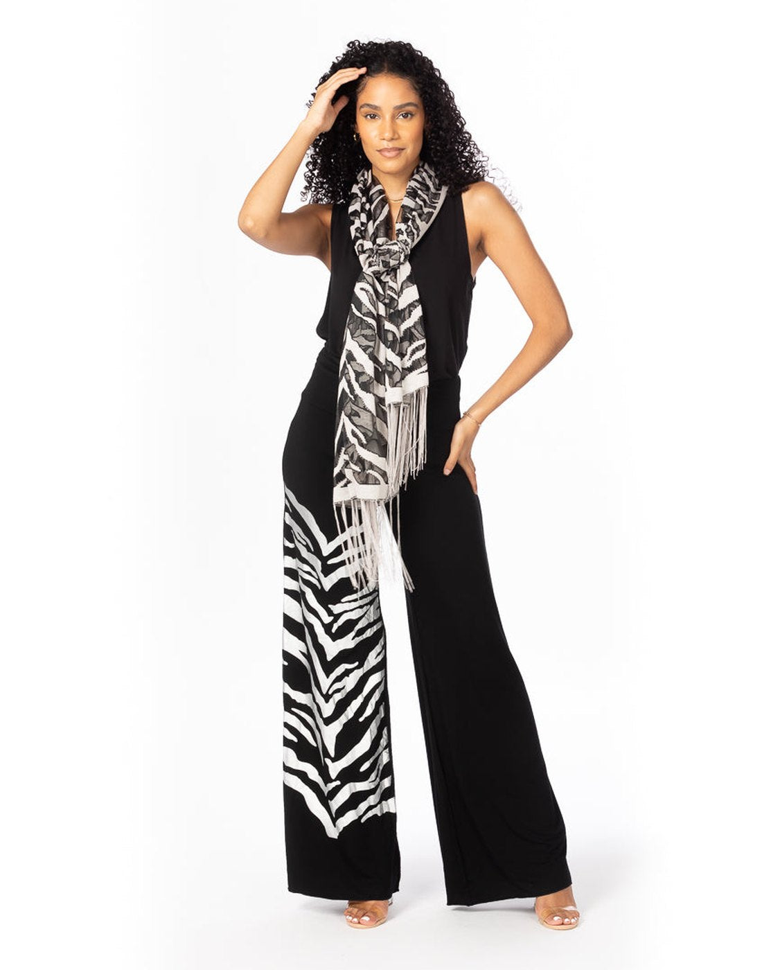El conjunto con estampado de tigre plateado: elegancia feroz de pies a cabeza. Libera tu fuerza interior con nuestra bufanda de 7 posiciones con estampado de tigre plateado y el pantalón Palazzo a juego: un dúo atrevido y sin esfuerzo diseñado para llamar la atención. La bufanda presenta un elegante estampado de tigre plateado sobre un suave negro desgastado, que combina energía feroz con sofisticación refinada. Con siete estilos, la ligera bufanda fluye maravillosamente: drapeada, envuelta, atada o llevada al hombro, lo que la convierte en un accesorio versátil para todo el año. Viene en talla única y favorece a todas las formas. El pantalón Palazzo a juego refleja el estampado con un llamativo panel vertical de patrón de tigre que cae en cascada por la pierna derecha. Diseñados con una silueta de pierna ancha para mayor comodidad y estilo, los pantalones están disponibles desde la talla pequeña hasta la extragrande, ofreciendo un ajuste perfecto para varios tipos de cuerpo. Juntos, este conjunto ofrece un estilo poderoso con facilidad, perfecto para elevar tu día a día o hacer una declaración en ocasiones especiales. Atrevido. Sofisticado. Indiscutiblemente feroz.
